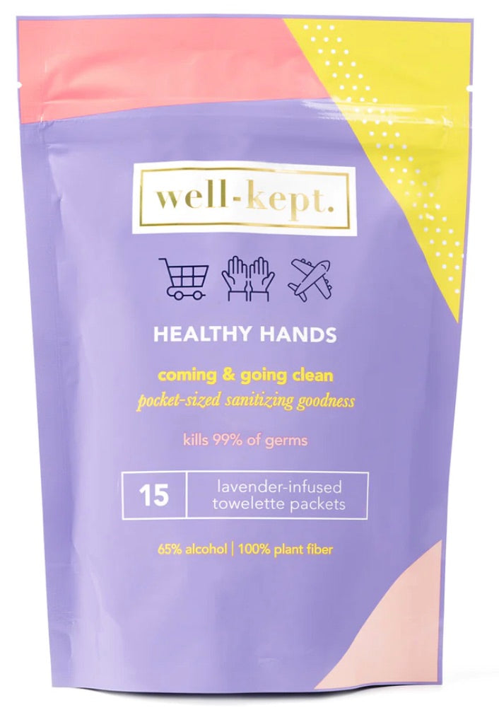 The Healthy Hands lavender-infused towelettes are sanitizing packets of goodness! Each pack contains 15 pre-moistened and individually wrapped towelettes.